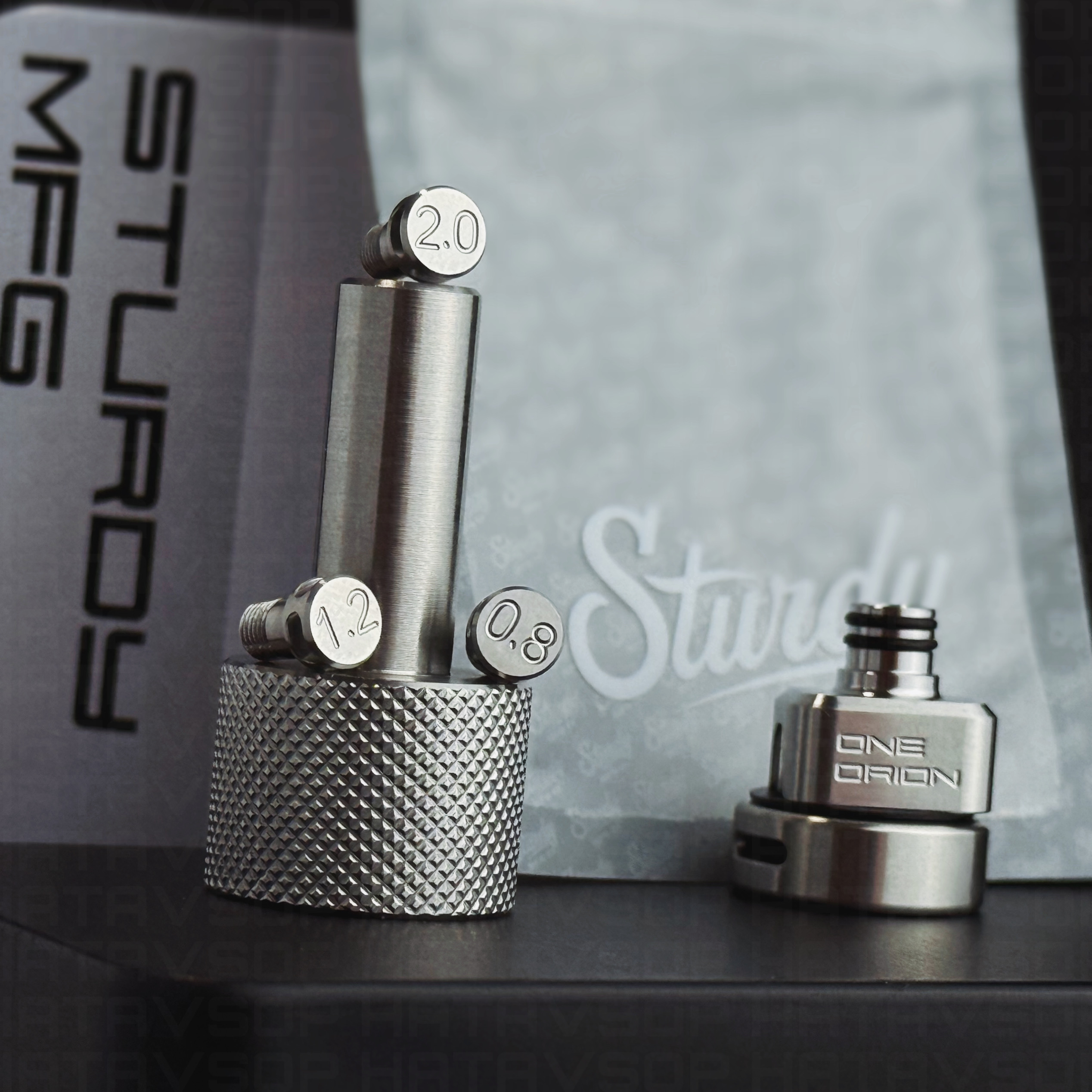 The airflow pin kit for the ONE Orion atomizer by Sturdy MFG allows precise customization of your vaping experience. Supplied with 0.8 mm, 1.2 mm, and 2.0 mm pins, this kit provides fine airflow adjustment to tailor the draw to your preferences.