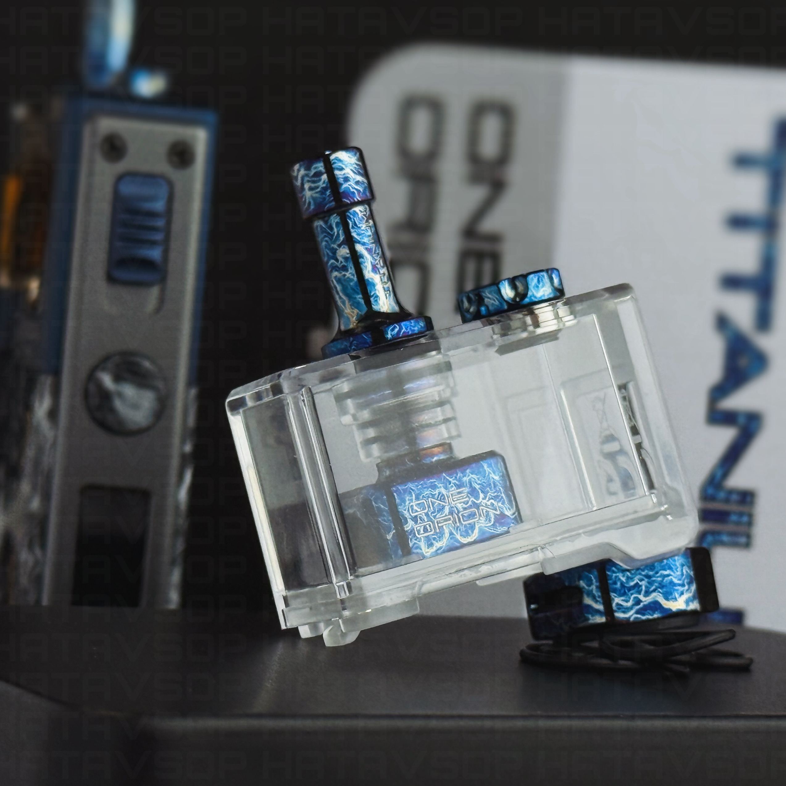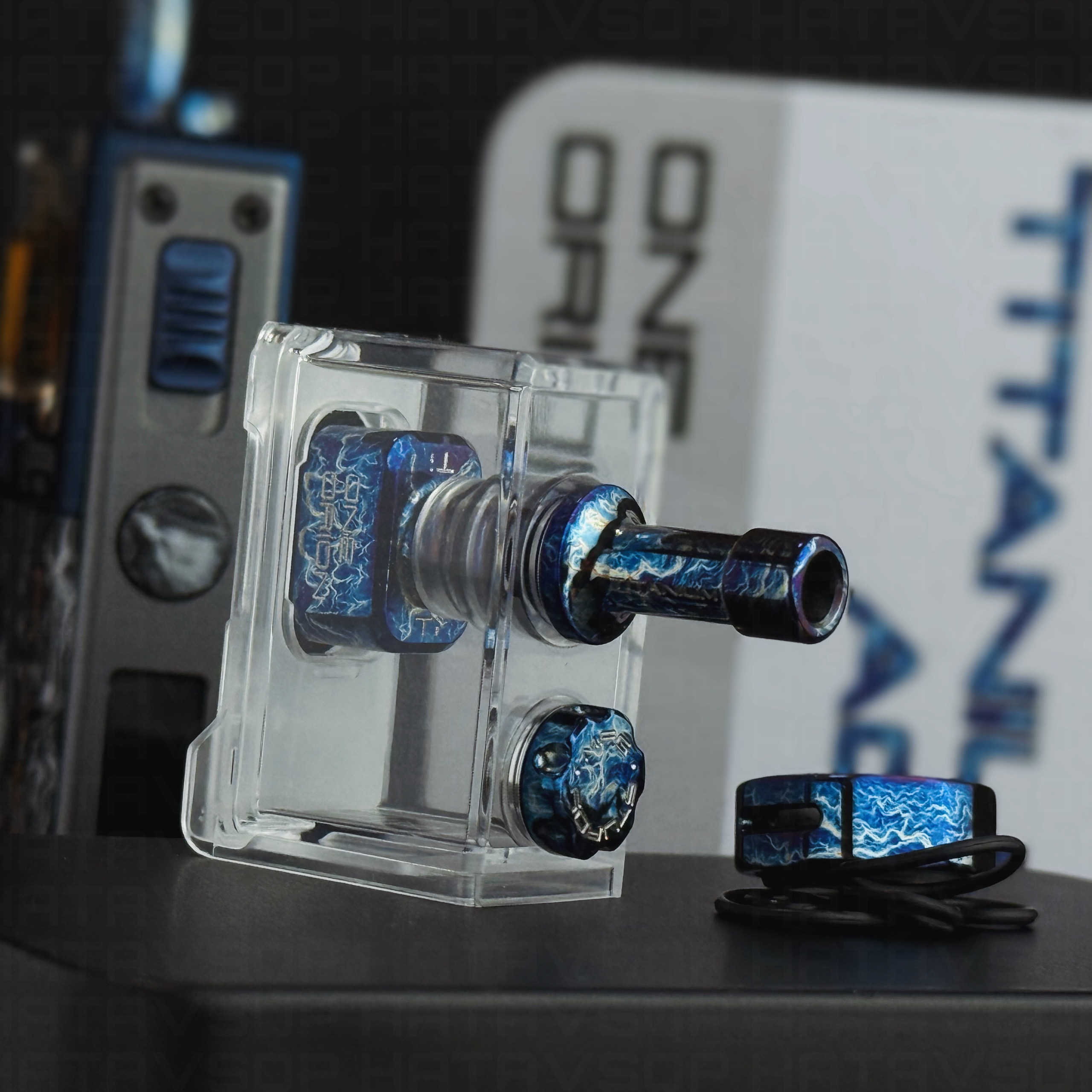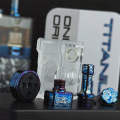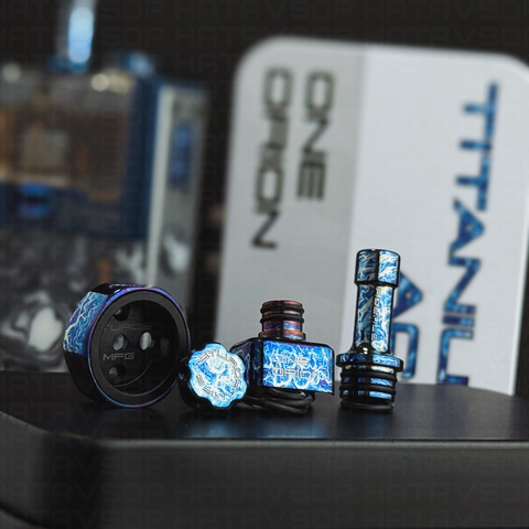 Compatible with the Orion II and Orion II Pro pods, this accessory kit allows certain parts of the mod to be replaced with titanium components featuring an entropic finish. It includes a top cap for the ONE Orion RBA, an airflow ring, a filling screw, and a titanium drip tip. The kit also includes a black PEEK insulating ring, engraved with the Sturdy MFG logo.